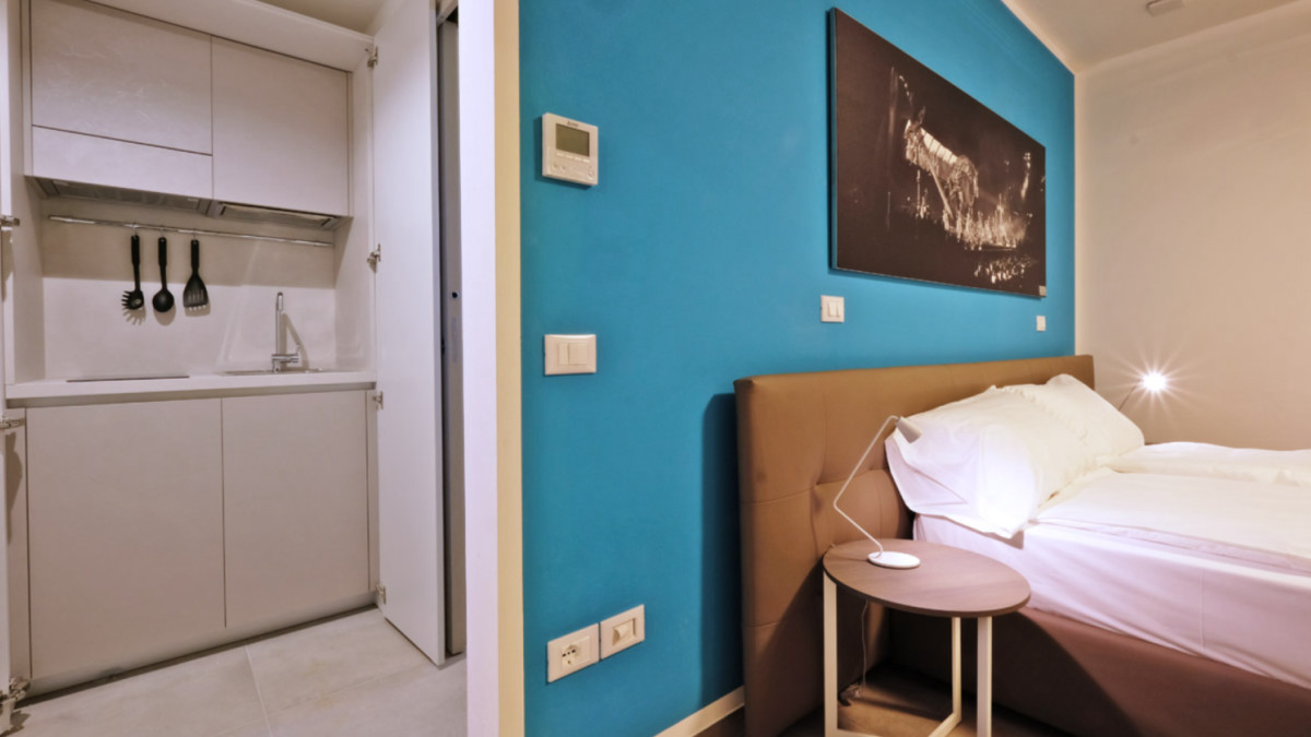 Dette Deluxe-værelse til 4 personer har et fuldt udstyret tekøkken, et soveværelse med dobbeltseng, en sovesofa til to personer og et skrivebord.