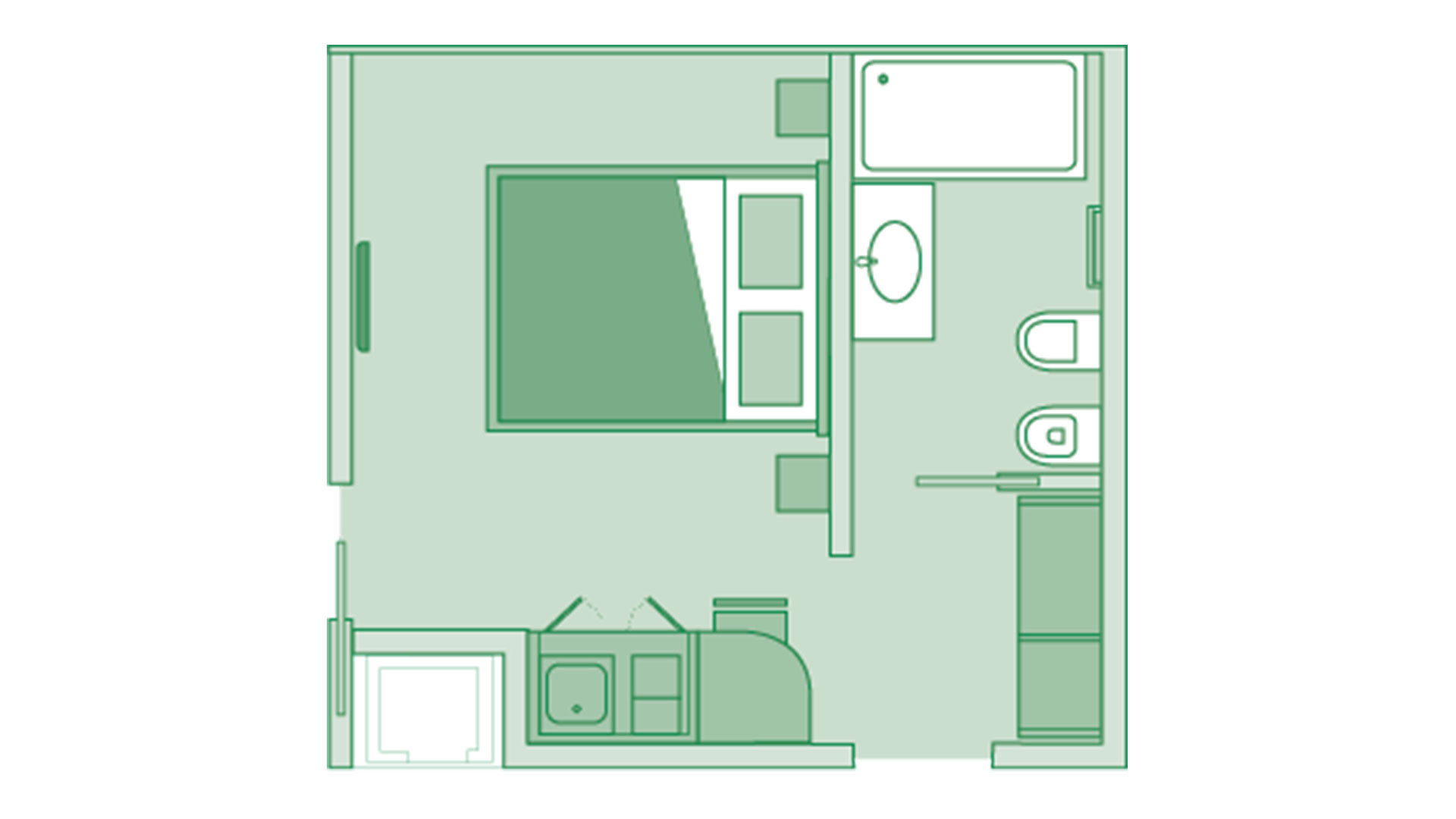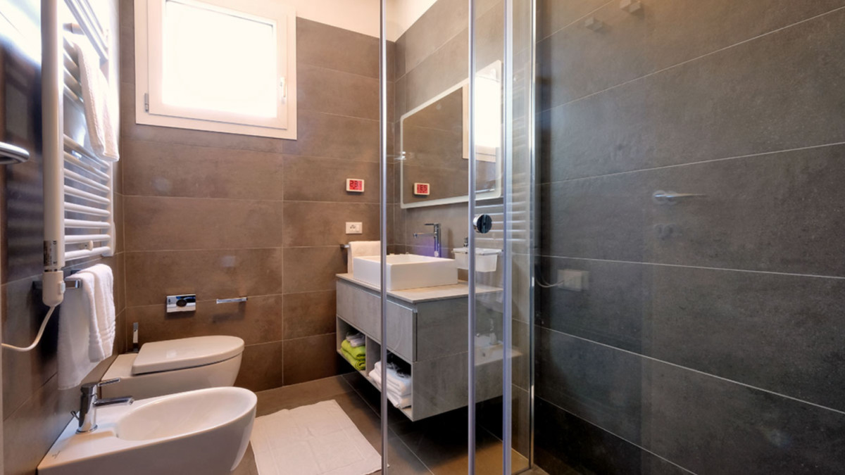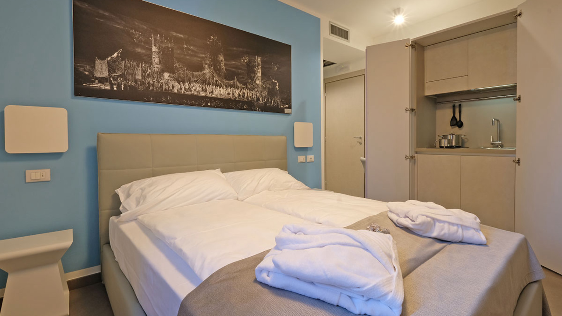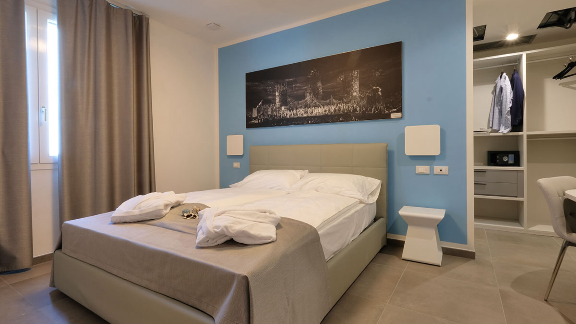 Il Trovatore is a charming Deluxe room on the first floor of Villa Clodia, featuring a window overlooking the garden. Ideal for two guests, it includes a kitchenette with induction hob and a double bed. The bathroom is equipped with a shower, bidet, toilet, and washbasin. A place you’ll never want to leave.